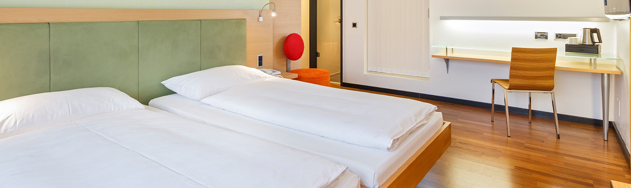 Erholen Sie sich nach einer hektischen Geschäftsreise, einem spannenden Meeting oder einem Städtebummel in einem unserer Zimmer. Geniessen Sie unseren Gästeservice mit vier Sternen. Buchen Sie direkt über unsere Website – Sie profitieren von unserer Bestpreis-Garantie und erhalten einmalig einen 2 für 1 Getränkegutschein an unserer Hotelbar.